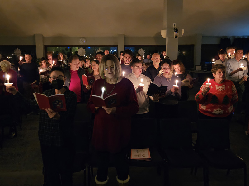 After worship services, congregants enjoy coffee, tea, other beverages and conversation in the Greeting Area.