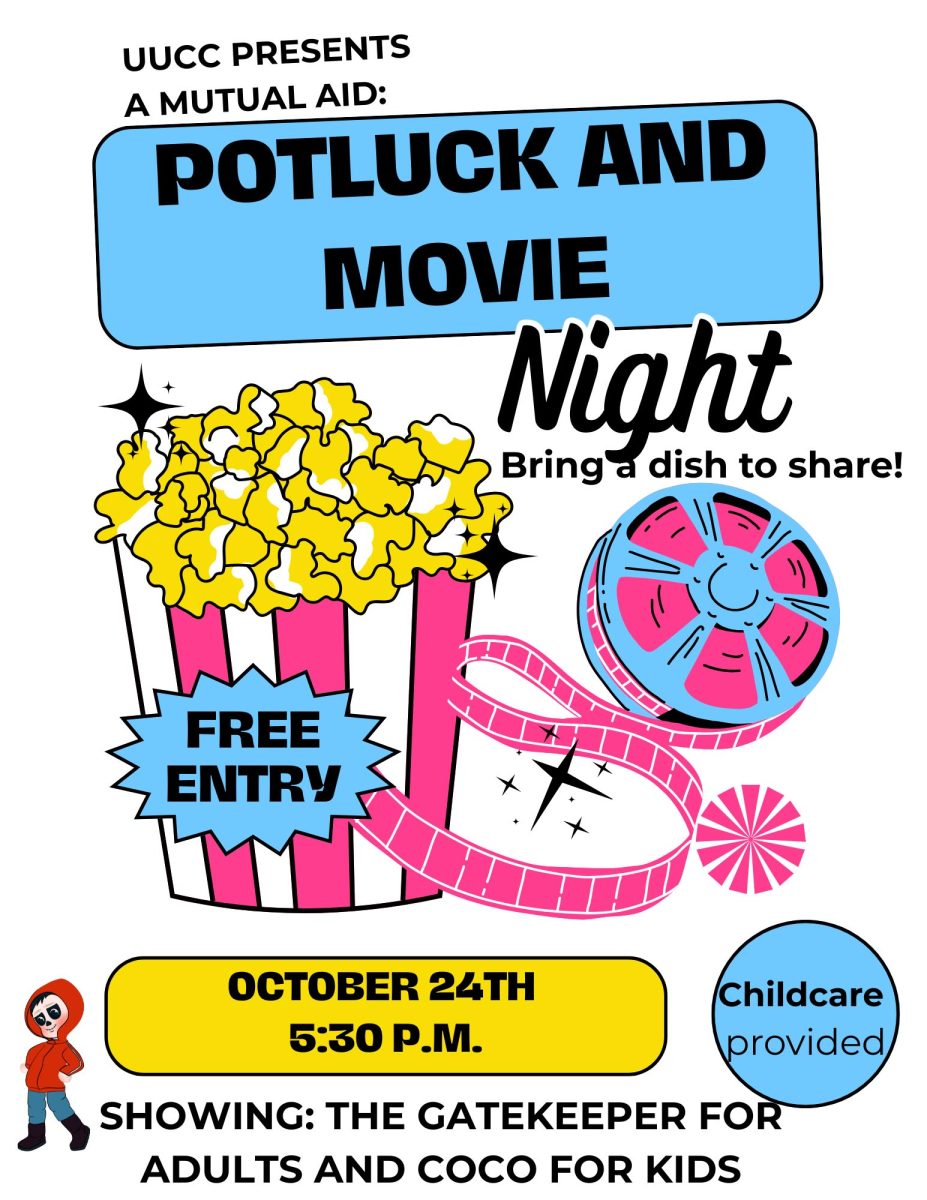 Join us at church for our first “Mutual Aid Potluck and Movie Night.” All will enjoy a potluck and then there will be movie showings of “The Gatekeepers” for adults and “Coco” for children (with childcare).